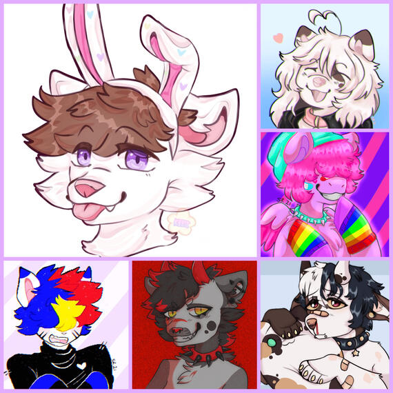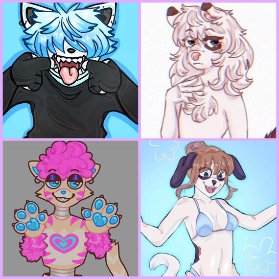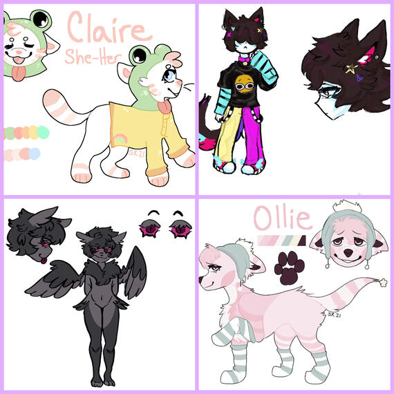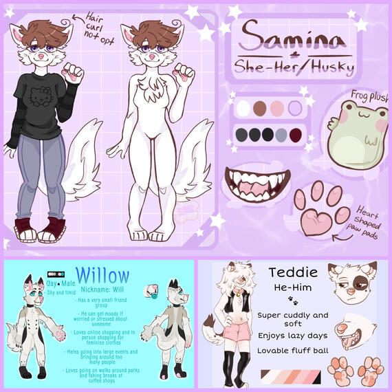 one fullbody shot, head closeup, name, pronouns, and a color palette (eyes, paws, and mouth closeups are opt)